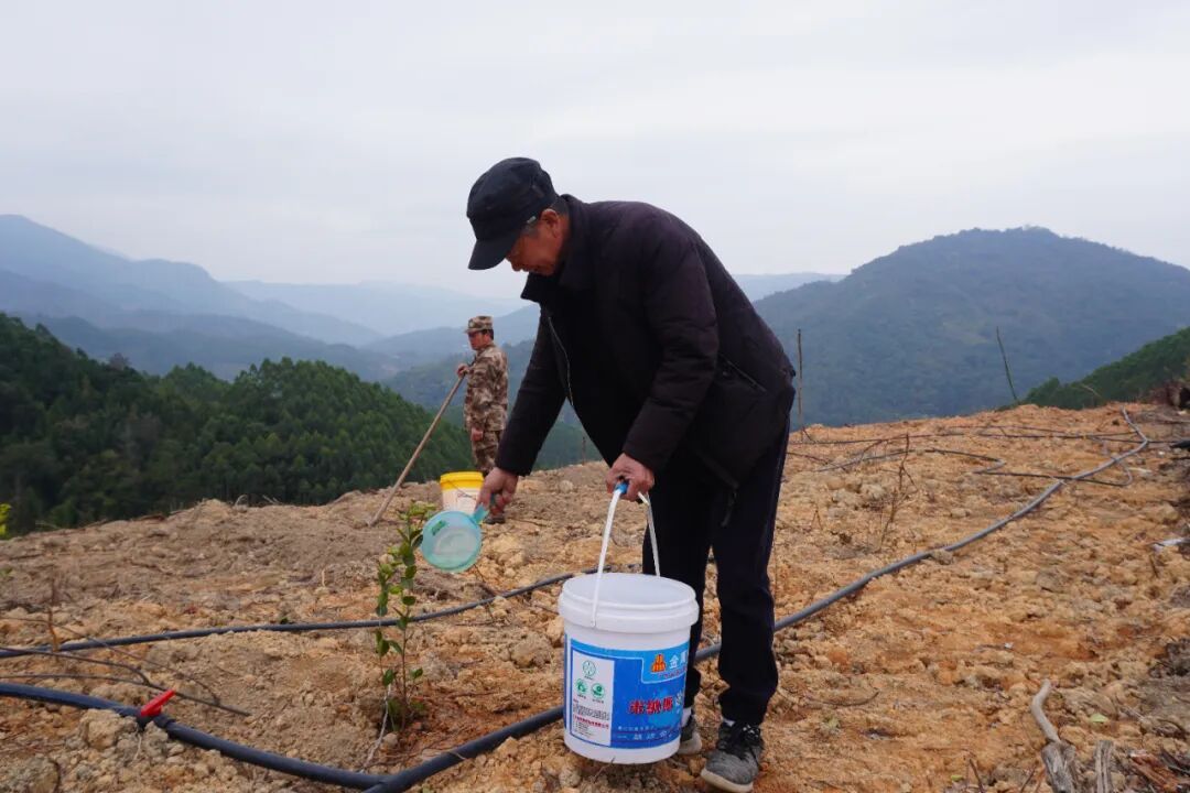 在嵩口镇龙湘村的山间坡地 一派热火朝天的植绿景象 镇村干部、护林员和群众代表分工协作 严格按照技术规范 完成挖坑、扶苗、培土、浇灌等工序 一株株优质高产油茶苗整齐扎根沃土 作为我县油茶产业的重要种植区之一 嵩口镇依托适宜的土壤气候条件 将造林绿化与特色产业发展深度融合 将荒山荒坡变成了助力农户增收、 壮大村集体经济的“绿色银行” 嵩口林业工作站站长 杨义强: “我们今年全镇安排的造林任务是1530多亩,目前已经完成了200多亩。我们今年造林的主要树种是油茶树和山樱花。下一步,我们将继续做好造林技术指导,为林农造林做好保障。”