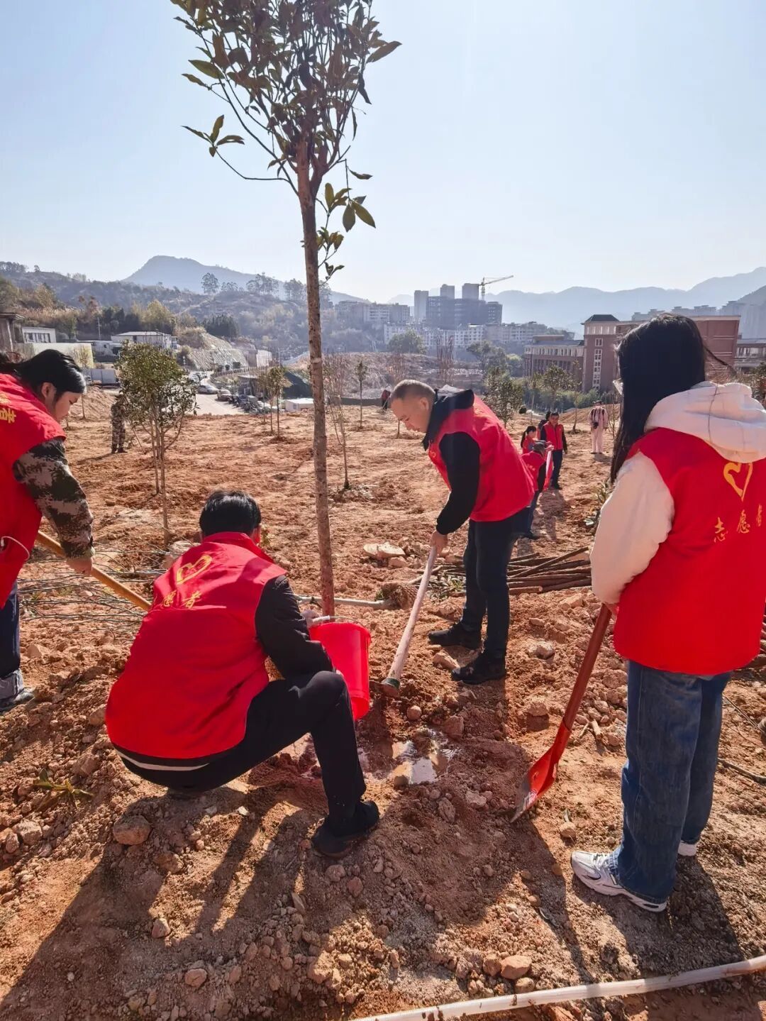 活动现场,大家三五一组 挥锹铲土、扶苗夯实、提水浇灌 合力种下桂花、紫玉兰等木苗 经过大家的相互协作 150株树苗迎风挺立、生机盎然 为永泰增添了勃勃生机