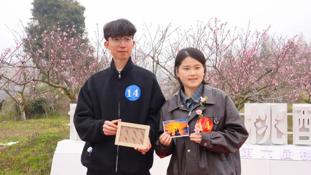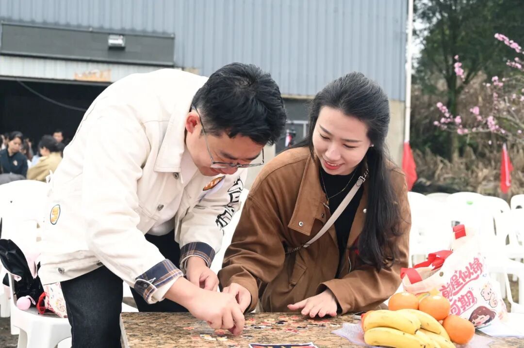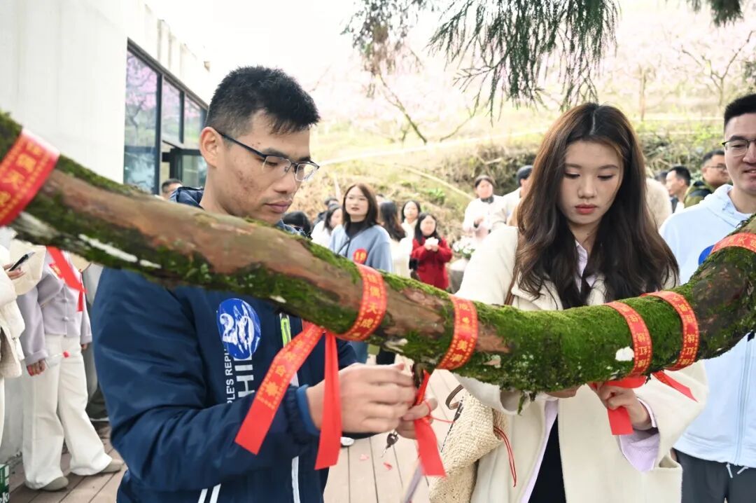 仪式落幕 春日寻缘之旅正式启程 参与活动的青年男女 凭借入场随机抽取的号码结对搭档 在青山花海间开启一场浪漫邂逅 大家首先奔赴有着五百年树龄的“柳杉王”下 携手系上寓意美好姻缘的红绳 在古树庇佑下虔诚祈福,许下良缘夙愿 随后漫步百亩桃园 共同认领专属桃树、悬挂纪念木牌 让桃花见证初见的心动