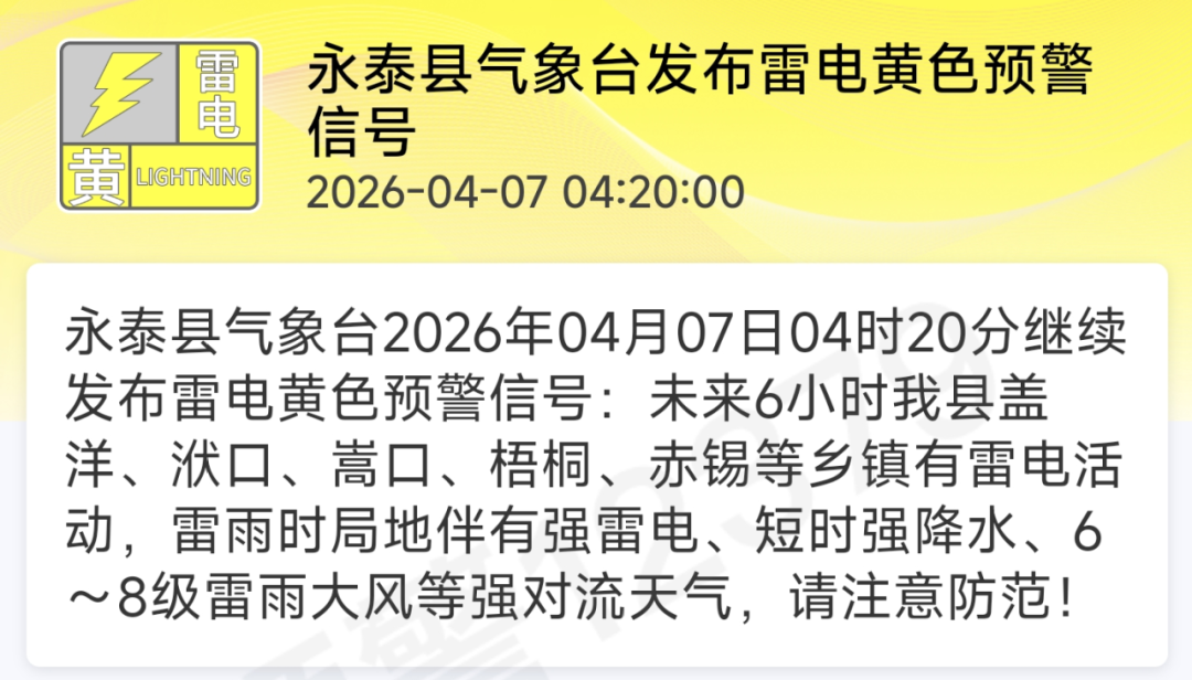 4月7日4时20分 永泰县气象台 继续发布 雷电黄色预警信号 要出门的永泰人注意了!