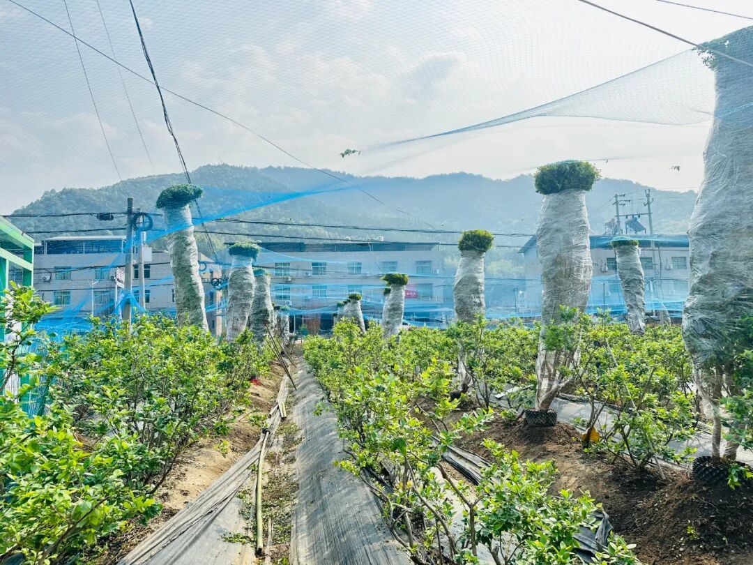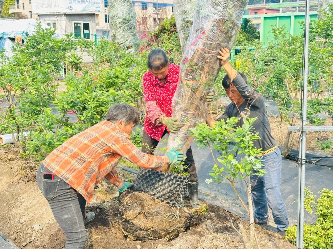 值得一提的是 在深耕蓝莓种植 这一主导产业的基础上 采摘园今年还新引进了 100棵15年树龄的沙巴树葡萄 和1万株树莓种苗 所有种苗均采用无公害种植模式 由专业技术人员现场指导 工人们严格按照规范栽种 全力保障种苗成活率 田园时代蓝莓采摘园技术指导工人 周志根: 整个种植过程也很讲究,我们需要先挖20-30公分左右的深坑,再下肥料,防止积水。而后用红绳将枝条收拢捆扎,避免移栽损伤;再用保鲜膜从树梢到主干缠绕包裹,锁住水分,做好全冠保湿,切实保障树苗成活率。