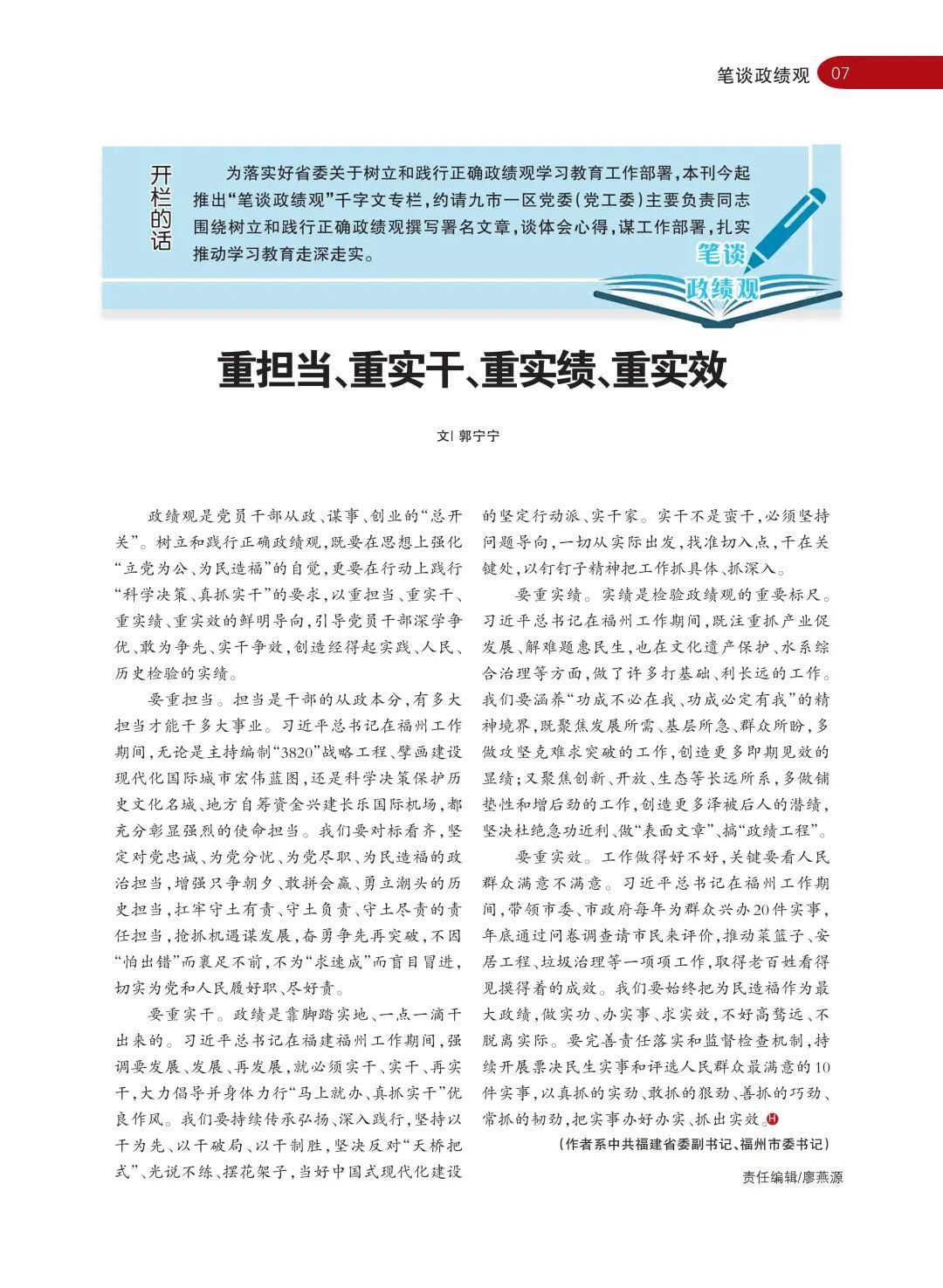 开栏的话 为落实好省委关于树立和践行正确政绩观学习教育工作部署,《海峡通讯》今起推出“笔谈政绩观”千字文专栏,约请九市一区党委(党工委)主要负责同志围绕树立和践行正确政绩观撰写署名文章,谈体会心得,谋工作部署,扎实推动学习教育走深走实。 政绩观是党员干部从政、谋事、创业的“总开关”。树立和践行正确政绩观,既要在思想上强化“立党为公、为民造福”的自觉,更要在行动上践行“科学决策、真抓实干”的要求,以重担当、重实干、重实绩、重实效的鲜明导向,引导党员干部深学争优、敢为争先、实干争效,创造经得起实践、人民、历史检验的实绩。 要重担当。担当是干部的从政本分,有多大担当才能干多大事业。习近平总书记在福州工作期间,无论是主持编制“3820”战略工程、擘画建设现代化国际城市宏伟蓝图,还是科学决策保护历史文化名城、地方自筹资金兴建长乐国际机场,都充分彰显强烈的使命担当。我们要对标看齐,坚定对党忠诚、为党分忧、为党尽职、为民造福的政治担当,增强只争朝夕、敢拼会赢、勇立潮头的历史担当,扛牢守土有责、守土负责、守土尽责的责任担当,抢抓机遇谋发展,奋勇争先再突破,不因“怕出错”而裹足不前,不为“求速成”而盲目冒进,切实为党和人民履好职、尽好责。 要重实干。政绩是靠脚踏实地、一点一滴干出来的。习近平总书记在福建福州工作期间,强调要发展、发展、再发展,就必须实干、实干、再实干,大力倡导并身体力行“马上就办、真抓实干”优良作风。我们要持续传承弘扬、深入践行,坚持以干为先、以干破局、以干制胜,坚决反对“天桥把式”、光说不练、摆花架子,当好中国式现代化建设的坚定行动派、实干家。实干不是蛮干,必须坚持问题导向,一切从实际出发,找准切入点,干在关键处,以钉钉子精神把工作抓具体、抓深入。 要重实绩。实绩是检验政绩观的重要标尺。习近平总书记在福州工作期间,既注重抓产业促发展、解难题惠民生,也在文化遗产保护、水系综合治理等方面,做了许多打基础、利长远的工作。我们要涵养“功成不必在我、功成必定有我”的精神境界,既聚焦发展所需、基层所急、群众所盼,多做攻坚克难求突破的工作,创造更多即期见效的显绩;又聚焦创新、开放、生态等长远所系,多做铺垫性和增后劲的工作,创造更多泽被后人的潜绩,坚决杜绝急功近利、做“表面文章”、搞“政绩工程”。 要重实效。工作做得好不好,关键要看人民群众满意不满意。习近平总书记在福州工作期间,带领市委、市政府每年为群众兴办20件实事,年底通过问卷调查请市民来评价,推动菜篮子、安居工程、垃圾治理等一项项工作,取得老百姓看得见摸得着的成效。我们要始终把为民造福作为最大政绩,做实功、办实事、求实效,不好高骛远、不脱离实际。要完善责任落实和监督检查机制,持续开展票决民生实事和评选人民群众最满意的10件实事,以真抓的实劲、敢抓的狠劲、善抓的巧劲、常抓的韧劲,把实事办好办实、抓出实效。 (作者系中共福建省委副书记、福州市委书记) |