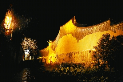 张元幹雕像 与白天不同,在灯光的塑造下,古镇的色彩变得更有层次感。夜色隐藏了一些繁杂,灯光凸显了精心布置的角落,粉色的桃花被雨点轻轻撞击,跳跃出柔美的弧线,雨丝清晰可见。一条小路,一段竹节,一截树根,一排瓦片,经过暖色光的修饰,有如一幅黑色背景的油画作品,站在古老的封火墙下,你突然就成了画中人。 这样的光线,这样的古建,真令摄影师惊喜。灯光设计师江海洋在去年为古镇做了整体的照明方案,他希望通过灯光的布置,照亮在白天容易被人们忽视的细节,他做到了。 撑伞走过窄窄的雨巷,偶然勾起江南园林的联想。穿厅过堂,不期而遇耀秋厝、注月楼这些古老的宅院,它们在沉静的夜里散发着无穷的吸引力,我却不免惊奇于“夜不闭户”的开放状态,古厝里除了开放区域的厅堂,一些房间里还住着居民,我们不敢高声言语,以免打扰了住户。